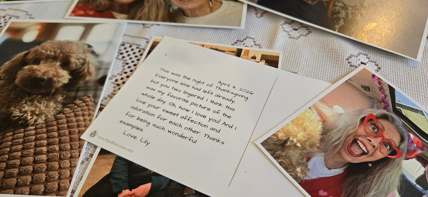 You may also order blank postcards, where you upload an image and tell us how many you would like us to print. We will leave the date, message area, and address blank so you can send those personalized postcards to anyone, whenever you want. Just email us at plaidpinecone@gmail.com or reach out to us via the Contact page.