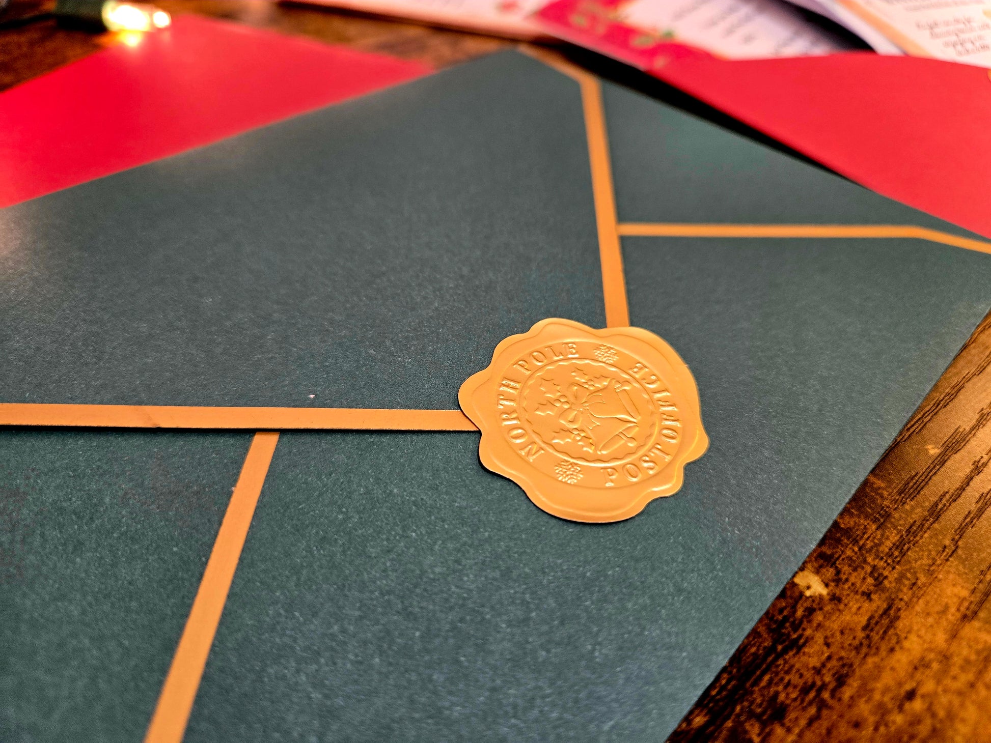 - Envelopes are sealed with official, gold North Pole Post Office stamps